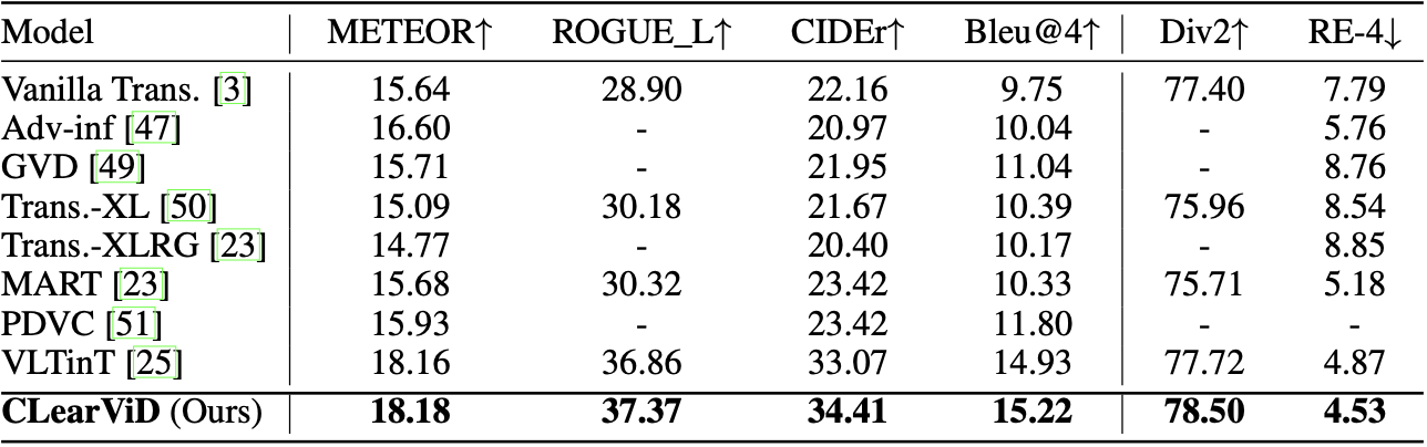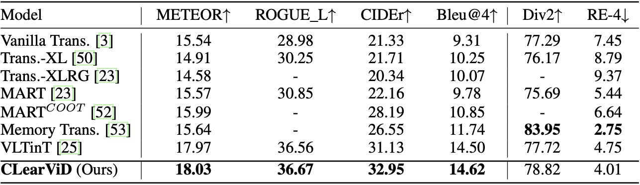 Performance comparison of CLearViD with other SOTA models. '-' denotes the paper did not report the score for that particular metric.