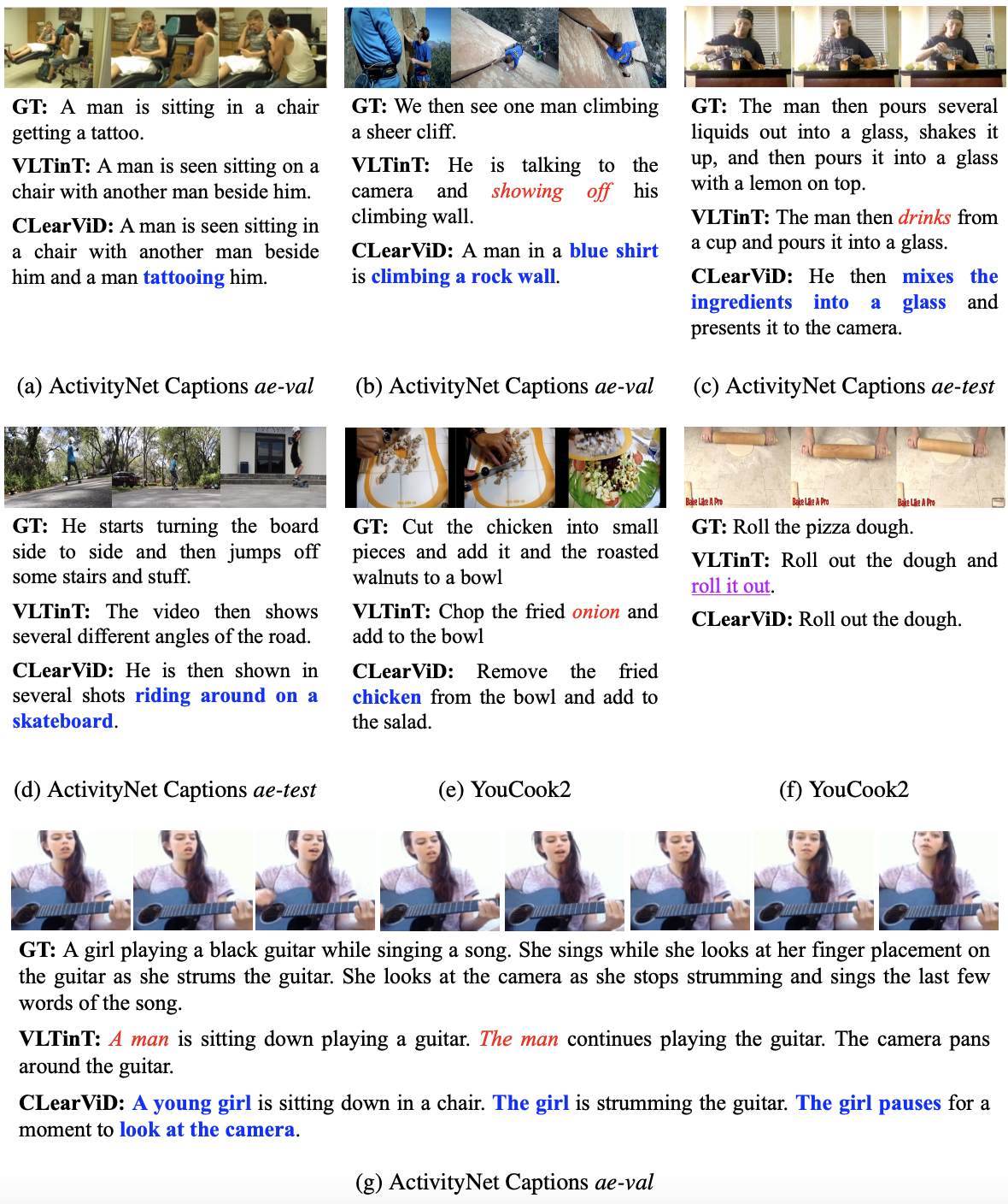 VLTinT baseline model and our proposed model, CLearViD. The examples are from the ActivityNet