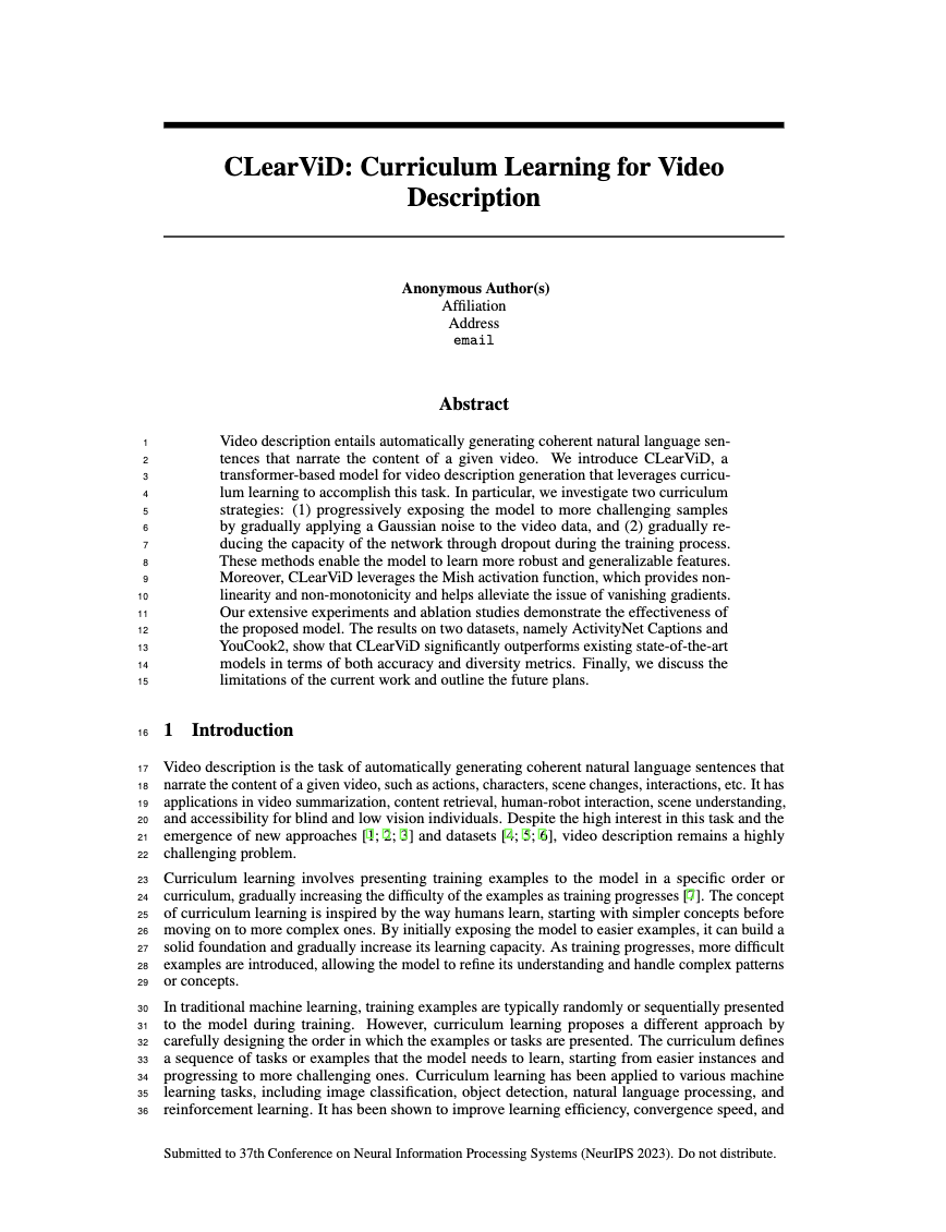 Video description entails automatically generating coherent natural language sentences that narrate the content of a given video. We introduce CLearViD, a transformer-based model for video description generation that leverages curriculum learning to accomplish this task. In particular, we investigate two curriculum strategies: (1) progressively exposing the model to more challenging samples by gradually applying a Gaussian noise to the video data, and (2) gradually reducing the capacity of the network through dropout during the training process. These methods enable the model to learn more robust and generalizable features. Moreover, CLearViD leverages the Mish activation function, which provides non-linearity and non-monotonicity and helps alleviate the issue of vanishing gradients. Our extensive experiments and ablation studies demonstrate the effectiveness of the proposed model. The results on two datasets, namely ActivityNet Captions and YouCook2, show that CLearViD significantly outperforms existing state-of-the-art models in terms of both accuracy and diversity metrics. Finally, we discuss the limitations of the current work and outline the future plans.